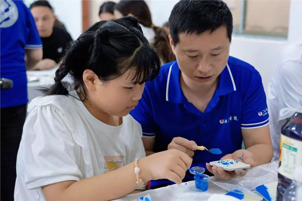 ▲在父母的陪伴與引導(dǎo)下,萌娃們用巧手將色彩斑斕的材料變?yōu)橐幻睹丢?dú)一無二的創(chuàng)意冰箱貼。