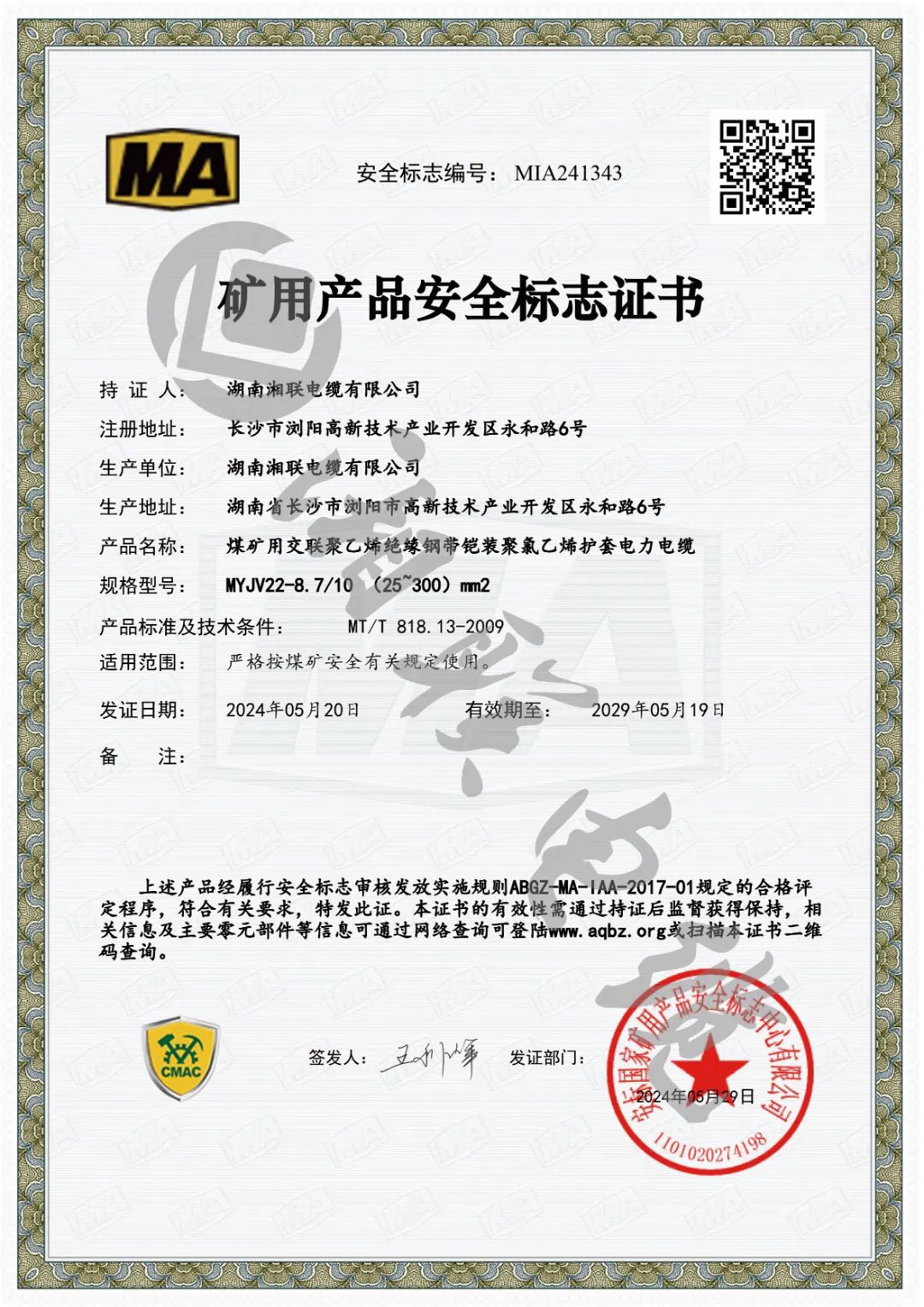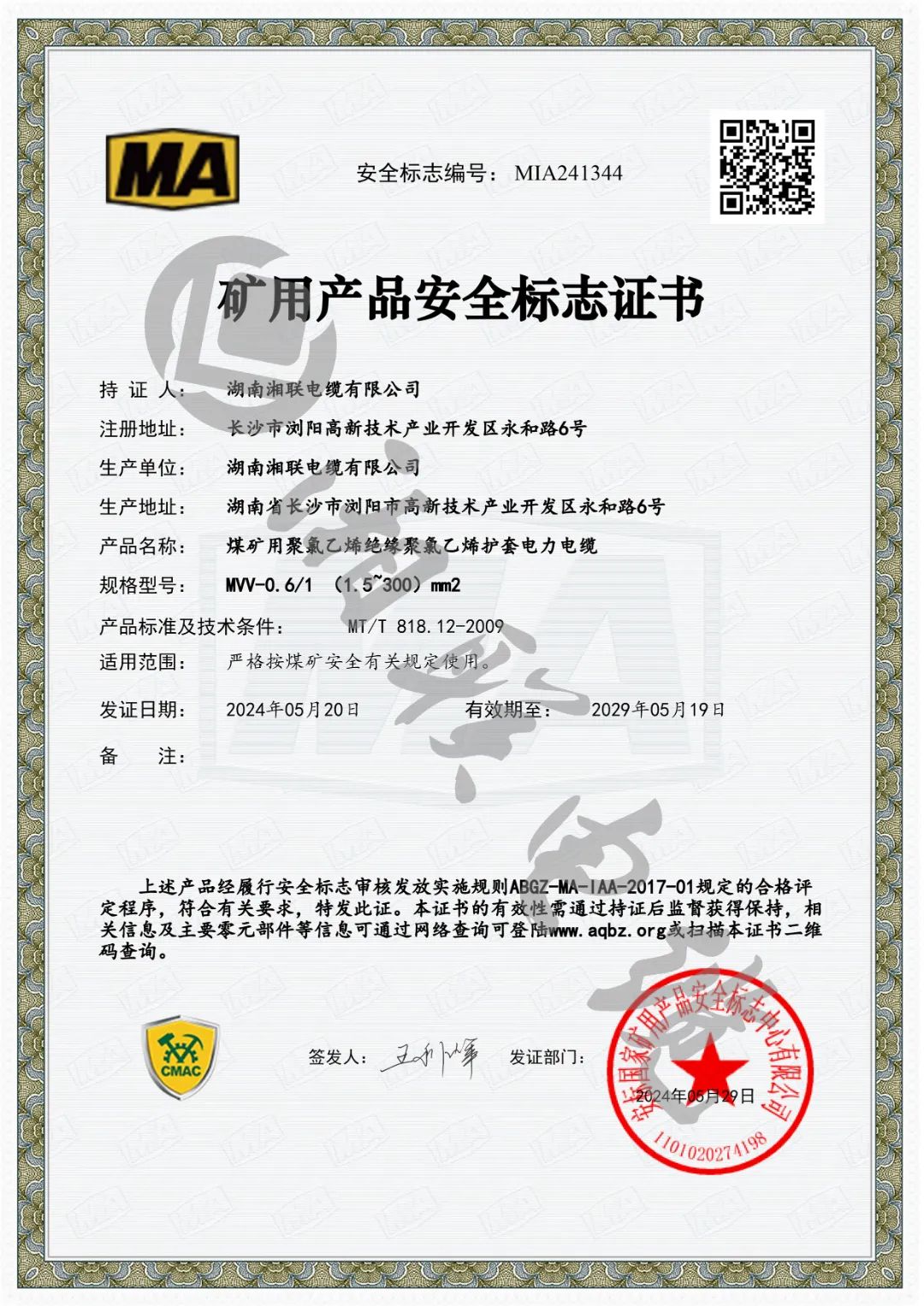 權(quán)威認證,湘聯(lián)電纜順利取得礦用產(chǎn)品安全標志證書!