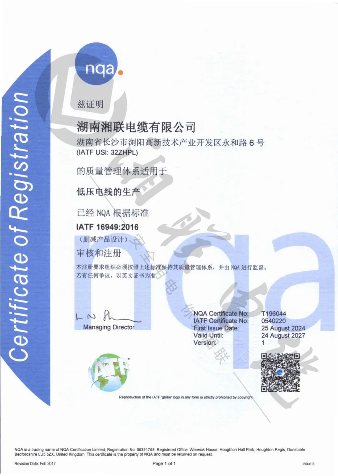 近日,湘聯電纜成功獲得了IATF16949:2016質量管理體系認證。IATF 16949:2016標準是專為汽車行業設計的質量管理體系標準,此項認證標志著湘聯電纜在質量管理體系、產品品質等方面均已滿足汽車行業的高質量管理標準。